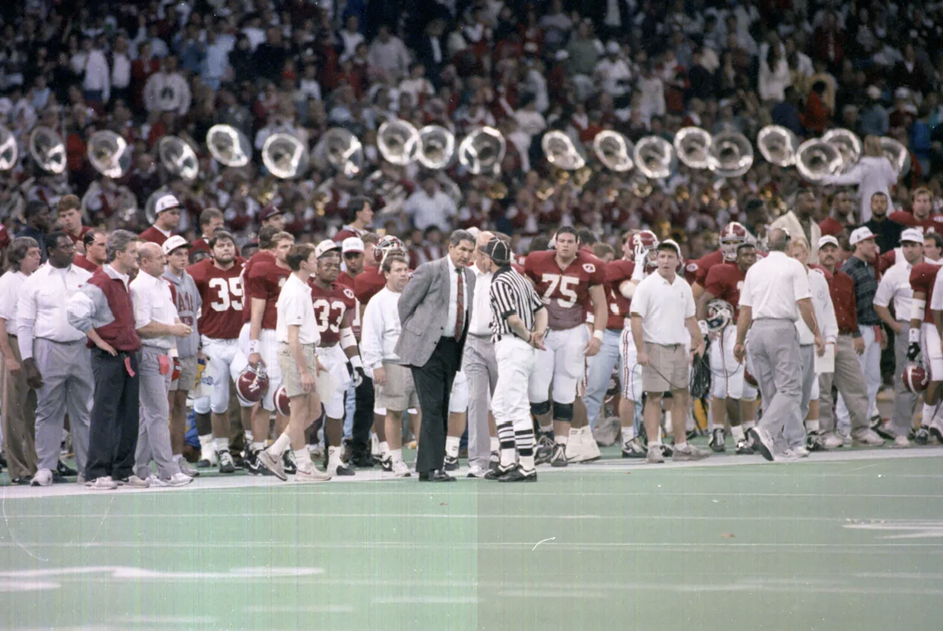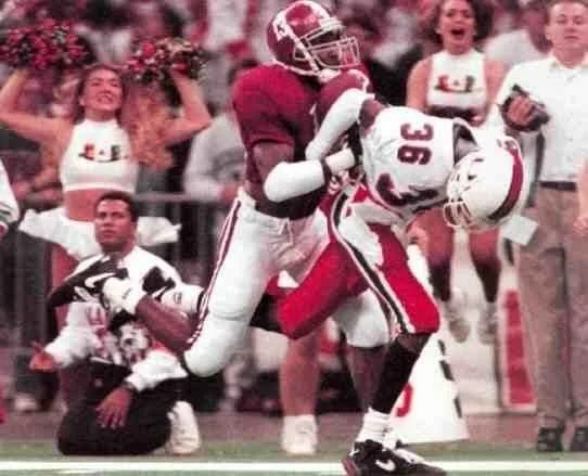 The first quarter started shaky, and it looked like Bama would score a TD first, but our defense held them to an FG. Then Bama held us to a FG. We traded fumbles and interceptions. Torretta was already having a bad game. He was off-target and under pressure. We had -15 rushing yards going into the 2nd Quarter. Yes, that is a ‘minus’. Bama was running well but hadn’t completed a pass. The score was 3-3.